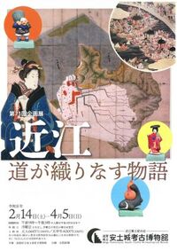 古くは「唐橋」と呼ばれた瀬田橋や、織田信長が安土城築城を機に整備した街道など今なお使われ続ける道もあります。人の行き交う道には、名物もつきもの。風光明媚な景色を描く「近江八景」の浮世絵や、茶の湯の流行にともなって作られた比良焼や臨湖焼といった雅趣に富む焼き物も、道を通じて広まりました。本展では、「この道を通ったのは誰か?」という視点から、県内の考古資料や絵画、県内の考古資料や絵画、古文書、工芸品を紹介します。