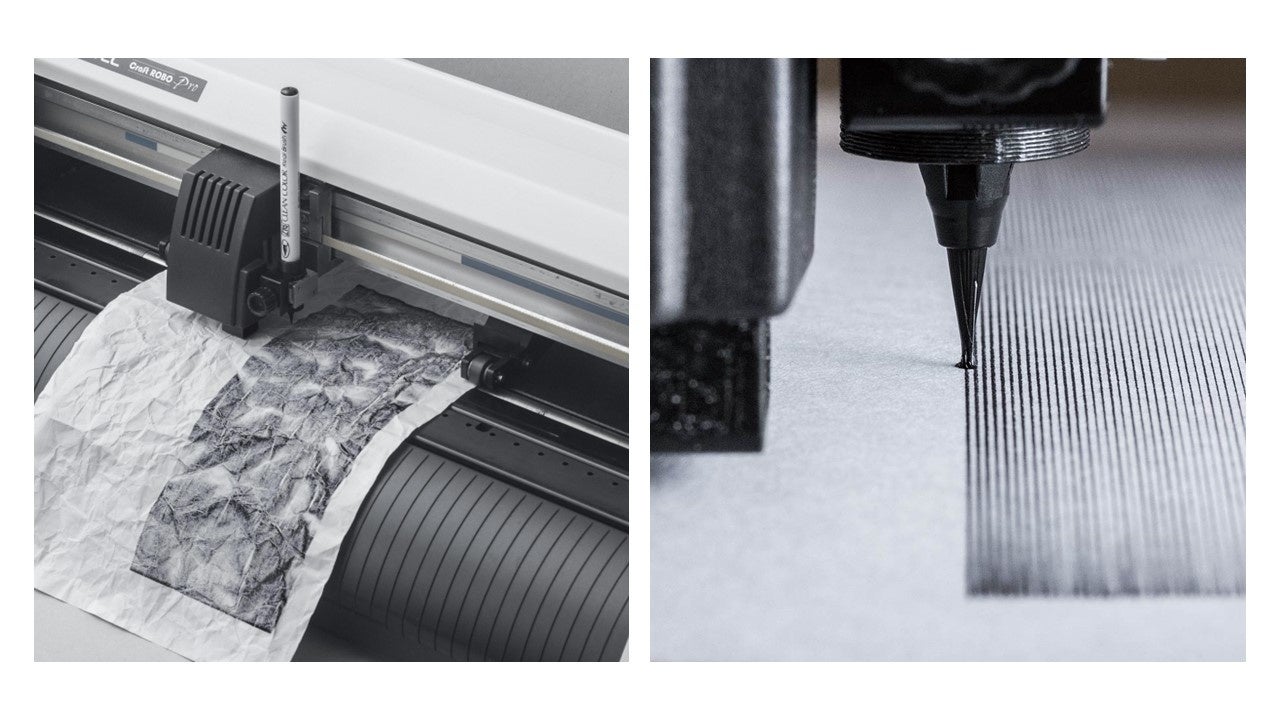 《Plotter Drawing (プロッタードローイング)について》深地は、プロッターという、ベクターデータを変換・出⼒する機器でデジタルデータを物理的な動きに変換し、鉛筆、ボールペン、筆ペン等の筆材で紙上にドローイングをおこなう独⾃の技法、「Plotter Drawing」を軸に、グラフィック表現の研究を⾏っています。デジタルデータの緻密な線情報が、さまざまな描画材によって紙に描かれることで、摩擦や重⼒、湿度や気圧などの物理的要因が作⽤して、「にじみ」や「かすれ」などの偶発的表現が⽣まれるPlotter Drawing。⼈の⼿で描いたものとも機械的なデジタルプリントとも違う、緻密でありながら暖かみのある筆致が特徴です。