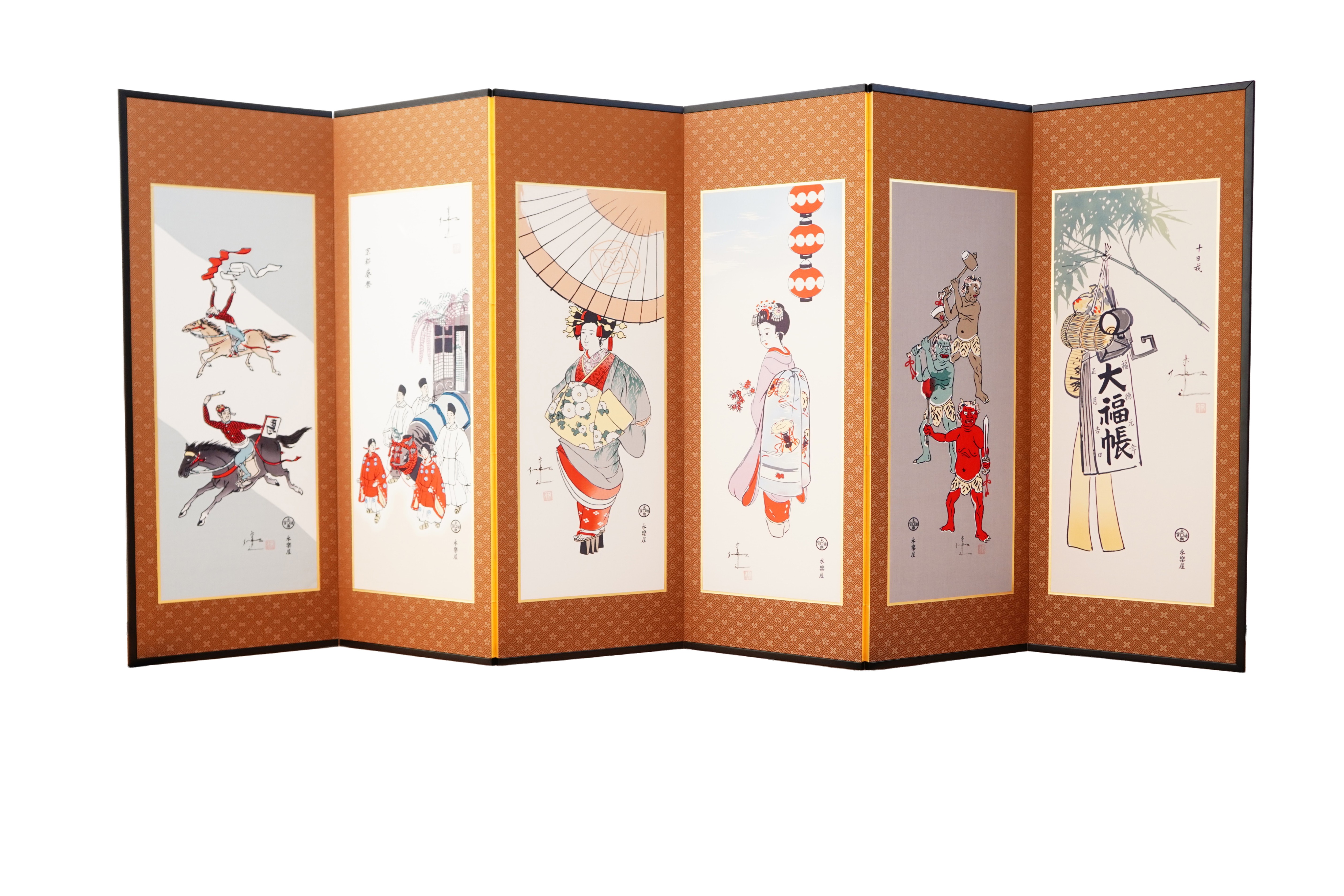 「百いろ会」の最高傑作とされる「京の年中行事シリーズ」は、画家・中島荘陽氏が十世細辻伊兵衛との親交をもとに制作したものです。京都の伝統的な年中行事を後世に伝えるべく描かれた貴重な12ヶ月の手ぬぐいを、屏風に仕立てています。下絵から糊置き、彩色、金彩に至るまで、二十を超える全ての工程において、それぞれの職人が技術を尽くして制作した手描き京友禅です。