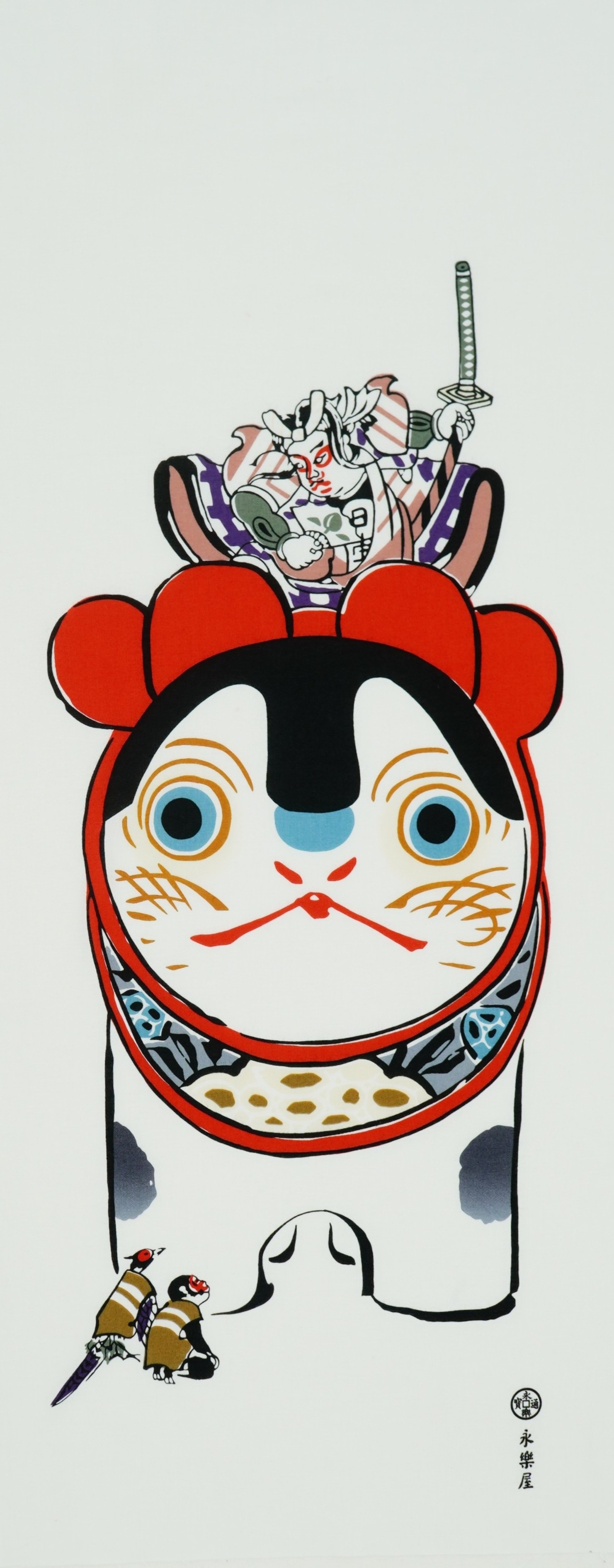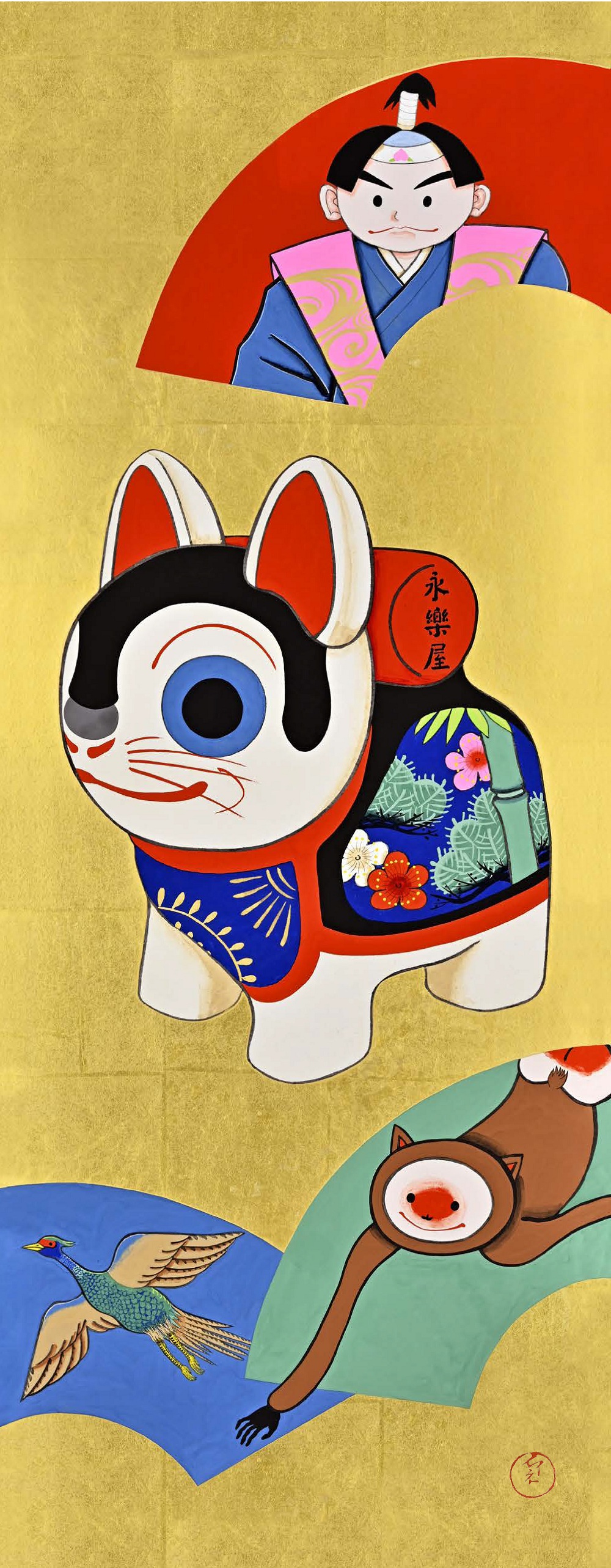 その中でも昭和7年(1932)に発表された『私は昔「桃太郎」と云われてました』は、とりわけ人気を集めた作品です。一見すると猫のようにも見えますが、実はモチーフは「犬」。足元には猿と雉、背には歌舞伎の隈取りを施した桃太郎を乗せた犬が大きく描かれています。縁起の良さとユーモアを併せ持つこのデザインは、時代を超えて多くの人々に親しまれてきました。