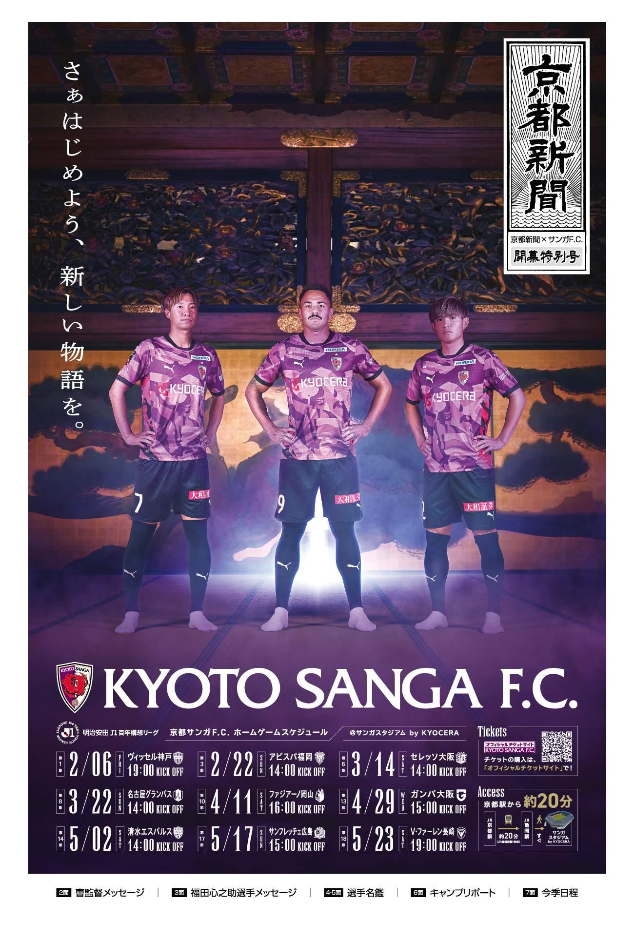当日は、曺貴裁監督のメッセージ、選手・スタッフ名鑑、「明治安田J1百年構想リーグ」の日程などを盛り込んだ、タブロイド判の開幕特別号を入場者に配布します。また、京都新聞に掲載されたサンガ関連記事のパネル展示も行います。ぜひスタジアムにご来場いただき、京都サンガを応援しましょう。