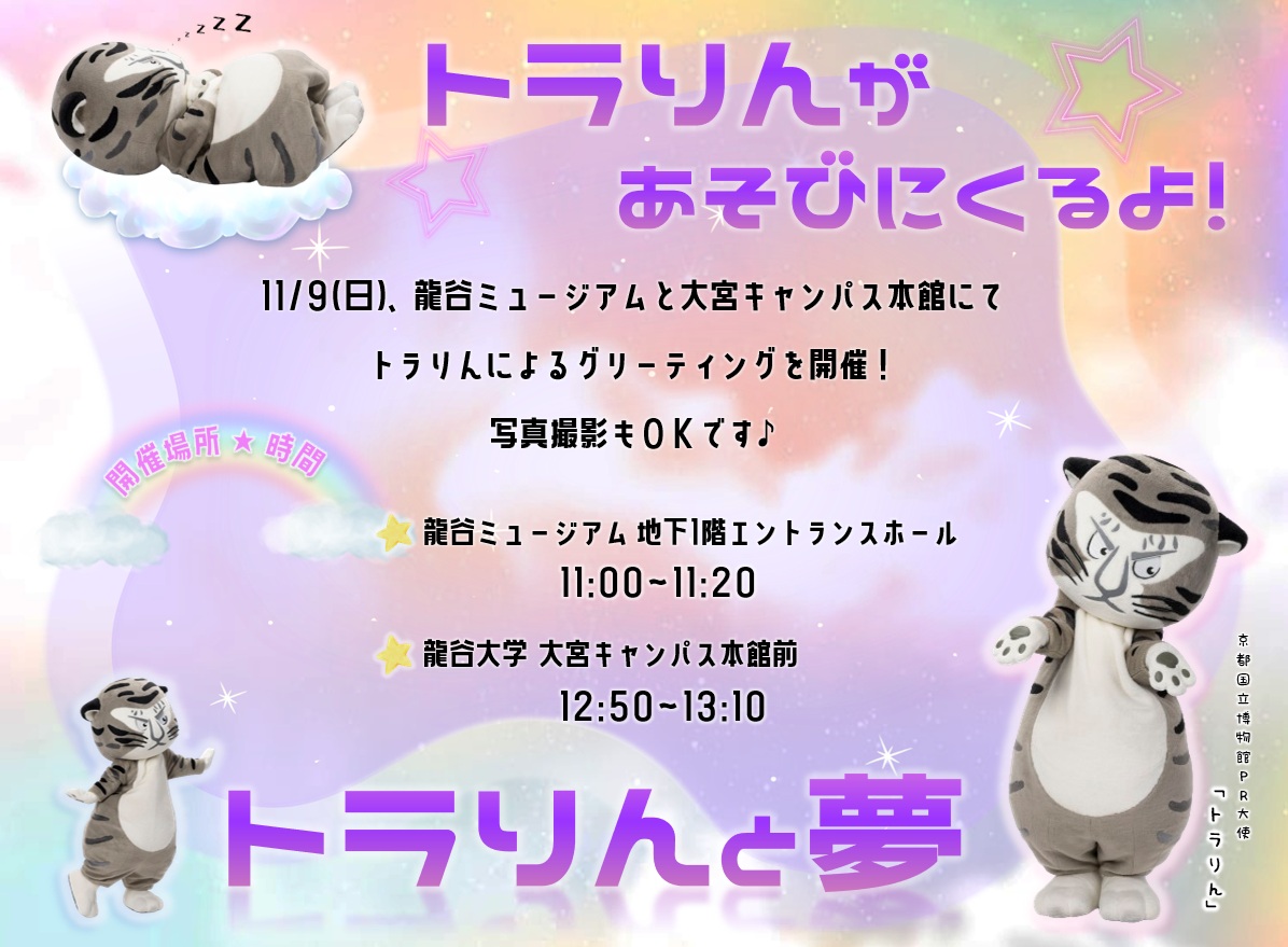 11月9日(日)、龍谷ミュージアムと大宮キャンパス本館にて京都国立博物館PR大使「トラりん」によるグリーティングを開催します! 写真撮影もOK!事前申込不要です。 是非お越しください!