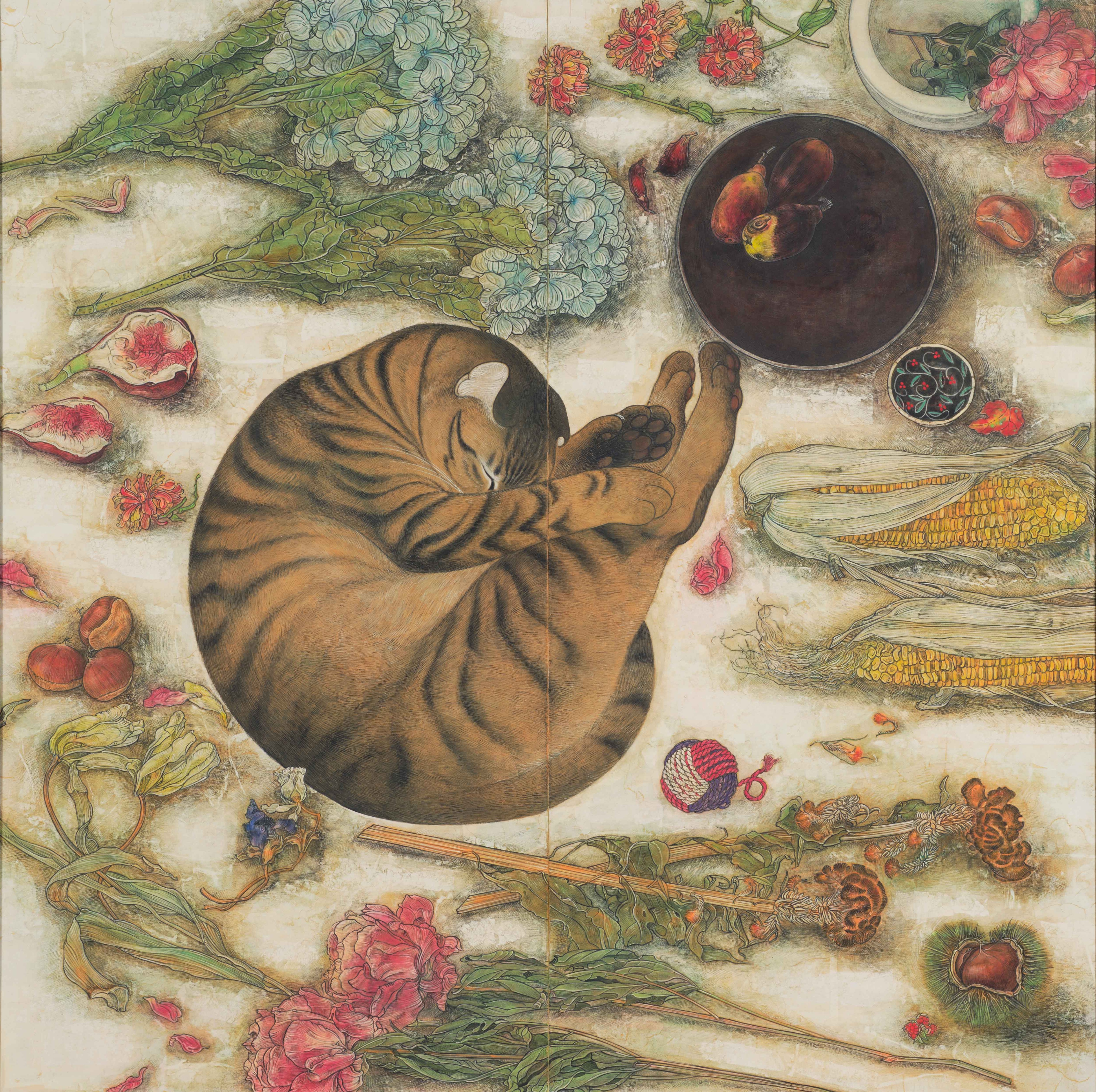 猫の丸い寝姿は惑星のようにも見えます。花々やお皿、おもちゃは猫の周りを回る衛星です。私にとっての猫のいる天体図。