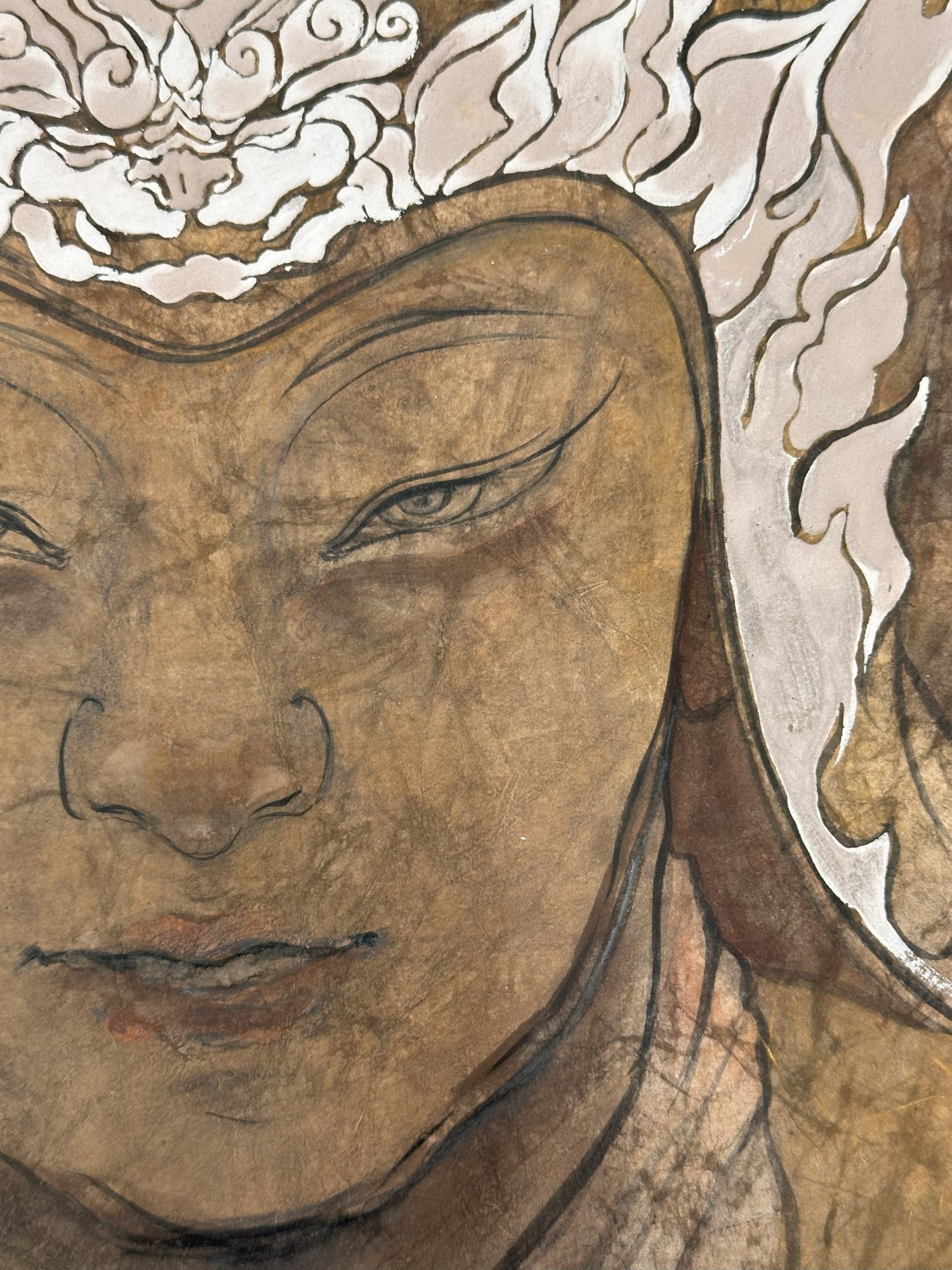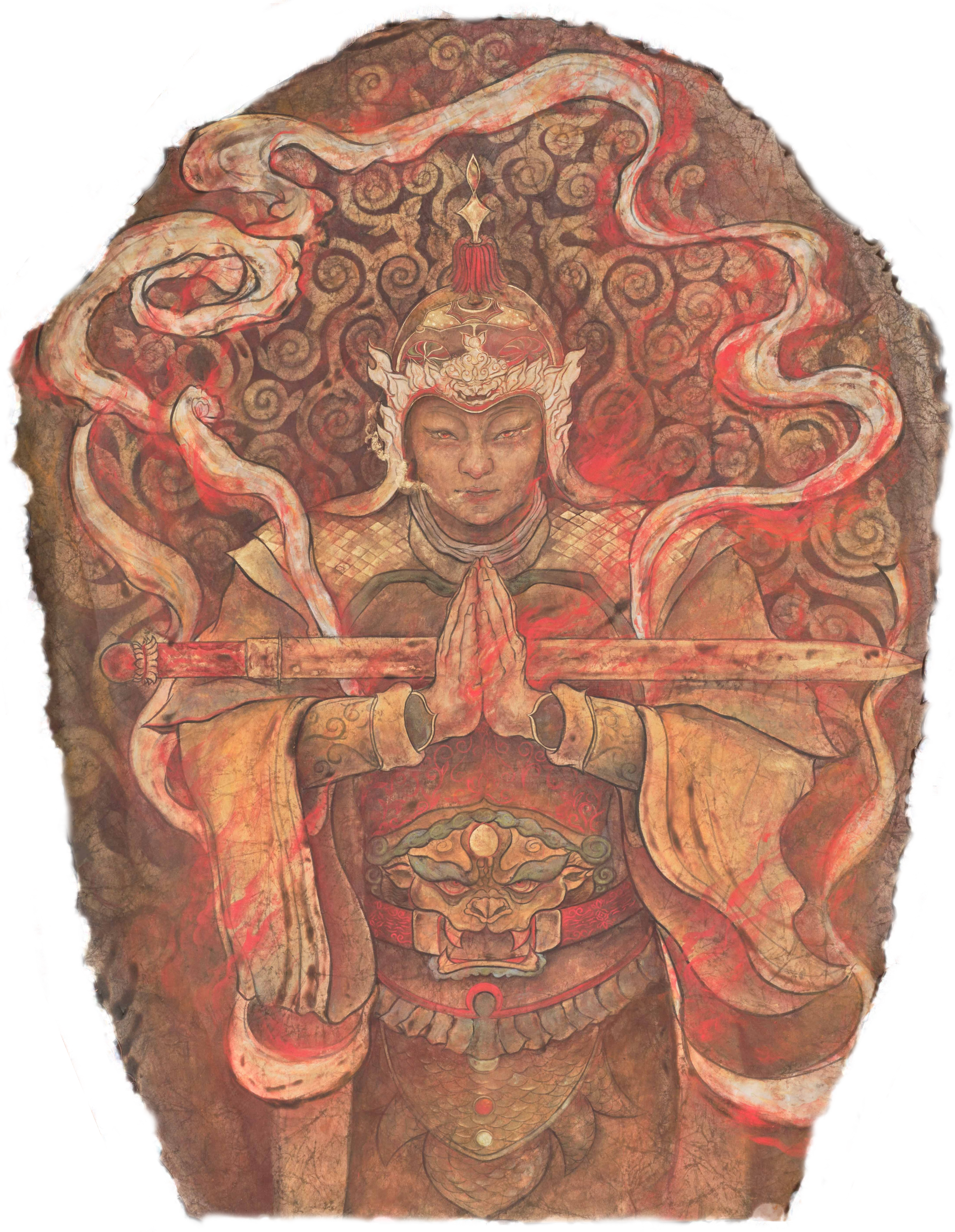 以前、京都国立博物館で萬福寺の韋駄天立像を見たとき、実際に目の前に舞い降りたかのような印象を受けました。韋駄天には、鬼に盗まれたお釈迦様の仏舎利を俊足で取り返し、仏教の伽藍の守護神となったという逸話があります。静かに燈るその眼差しから、揺らぐ社会の中で力強く生き続ける決心を抱きました。