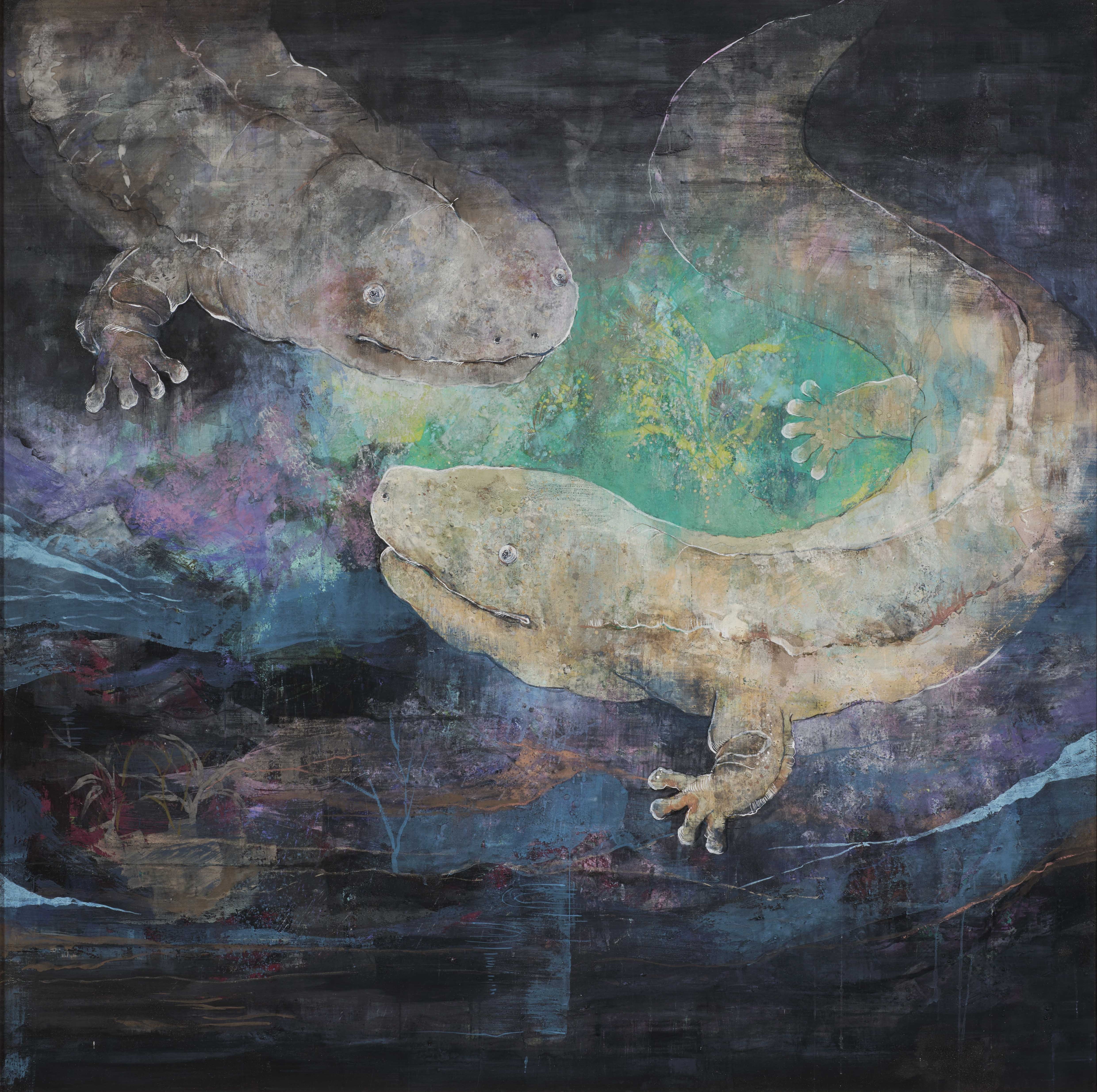 自然界で生きることの厳しさと美しさ、一瞬の緊張感の中に宿るオオサンショウウオの悠然とした佇まいの表現を試みた。
