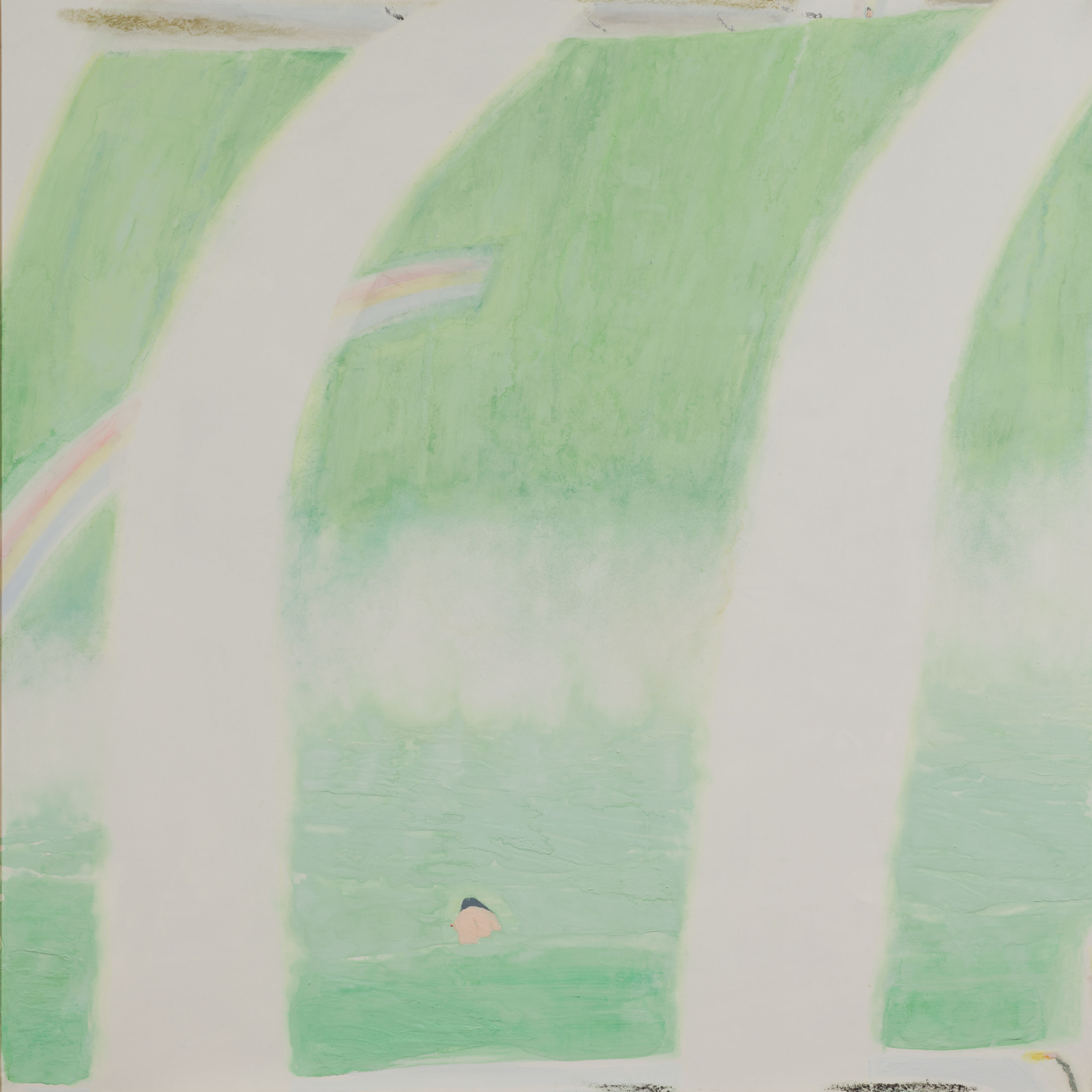 日常の記憶をモチーフに、心や体で感じた「感覚そのもの」を視覚化し、鑑賞者の内面にまで作用するような絵画空間の可能性を探究しています。今回の作品は、カナダのナイアガラフォールズでの、壁が迫りくるように流れ落ちる大迫力の滝と水しぶき、虹といった大自然が織りなす風景がきっかけとなりました。その出会いの中で湧き上がってきた感覚や気配、そしてその場の空気が持つ解放感のようなものを、日本画材の色彩や質感、画面構成などの要素を組み合わせて画面上に表現してみました。